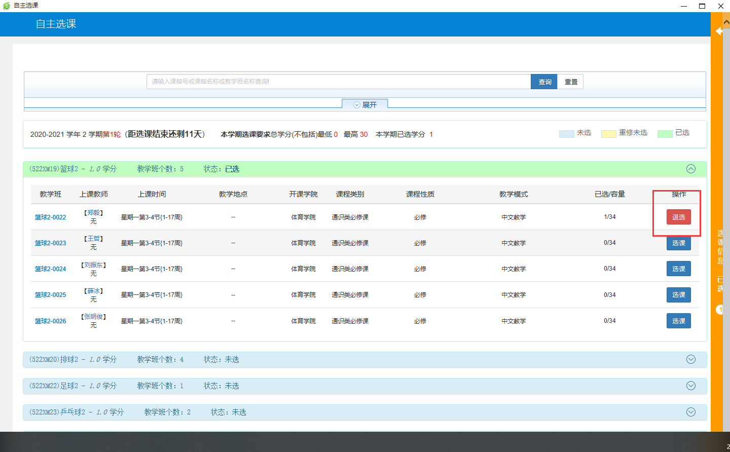 点击“查询”按钮,在页面下方会出现本学期已开通的所有可选课条目。
