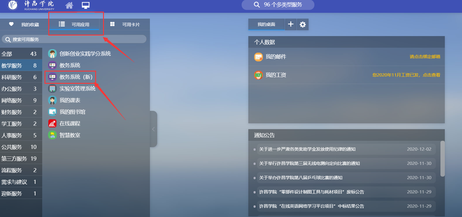 点击左侧“可用应用”,在“教学服务”选项卡中查找“教务系统(新)”选项。