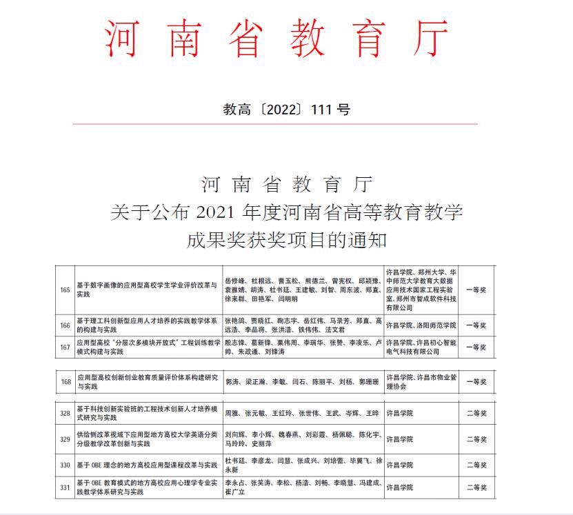 近日,河南省教育厅下发了《关于公布2021年度河南省高等教育教学成果奖获奖项目的通知》,我校推荐的8项教学成果全部获奖,其中岳修峰校长申报的《基于数字画像的应用型高校学生学业评价改革与实践》等4项成果被评为一等奖,电气与机械工程学院周雅老师申报的《基于科技创新实验班的工程技术创新人才培养模式研究与实践》等4项成果被评为二等奖,实现了我校省级教学成果奖获奖数量新突破。