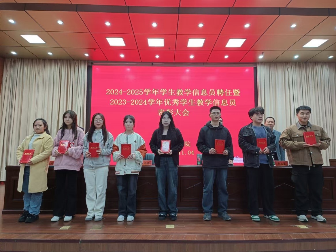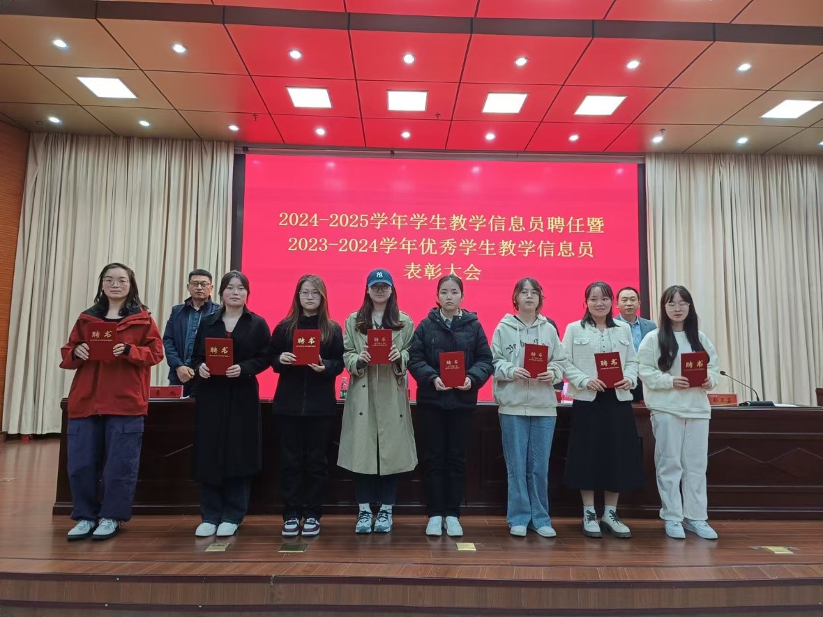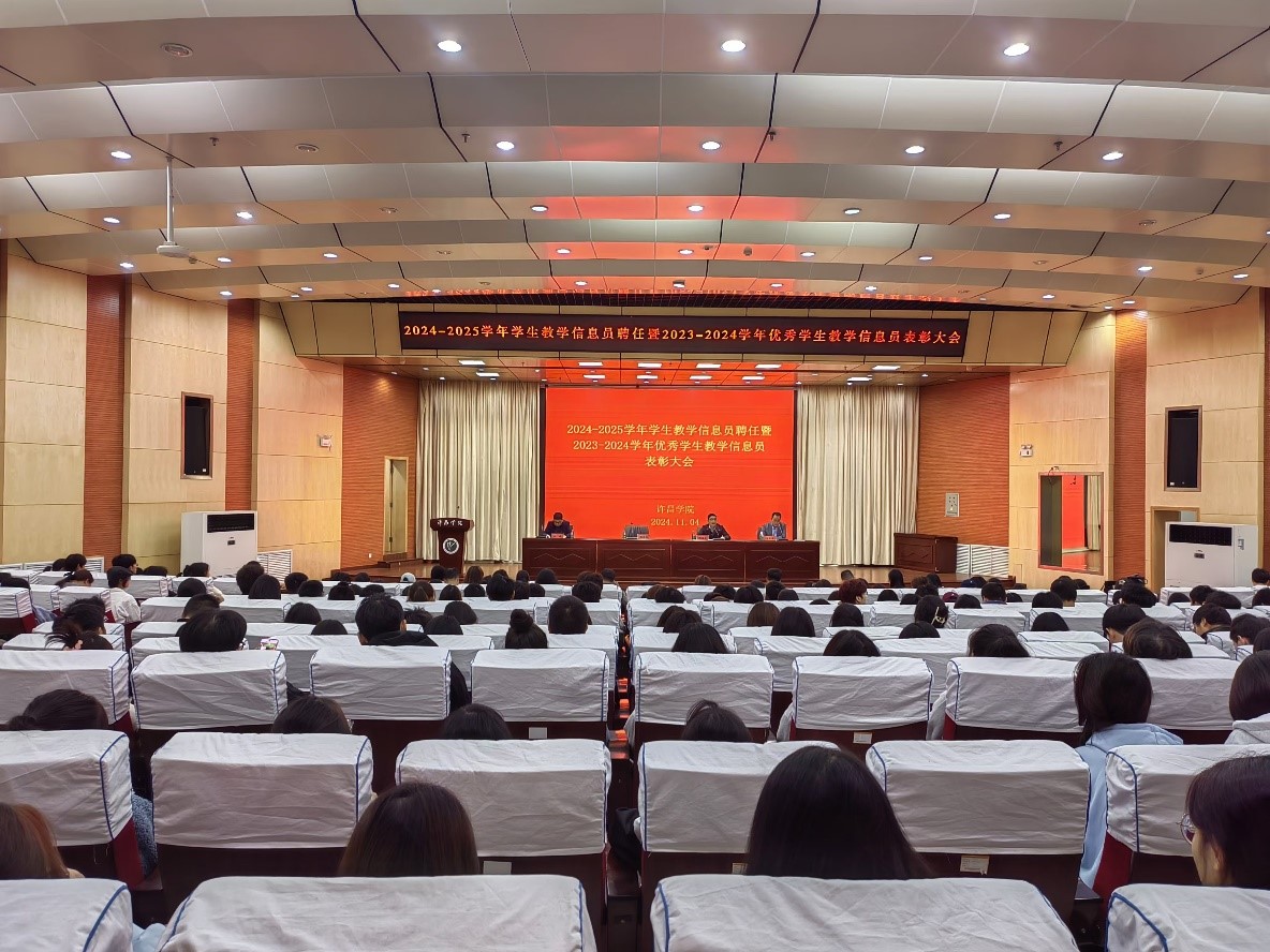 11月4日下午,我校在图书馆学术报告厅隆重召开2024-2025学年学生教学信息员聘任暨2023-2024学年优秀学生教学信息员表彰大会。教务处(教学质量监控与评估中心)副处长郭卫芸、学生处副处长李鹏、校团委副书记郗磊磊、承担有学生信息员导师任务的校级教学督导委员、教务处及各学院负责教学质量管理工作的教师、2023-2024学年全体优秀学生教学信息员及2024-2025学年新聘任学生教学信息员代表参加了大会。大会由教务处副处长郭卫芸主持。