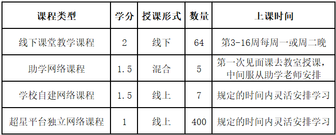 1.课程类型:本学期开设有线下课堂教学课程、助学网络课程(配备校内助学教师)、学校自建网络课程、超星平台独立网络课程,课程各类型数量、学分及相关说明如下: