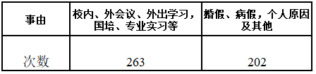 在465次调课中,调课事由一般有公务事假、进修学习、病假、事假等原因(还有部分事由填写不清),具体情况如下: