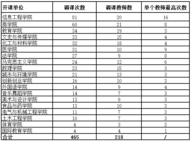 截止到本学期第九周(4月30日),教务处对各教学单位所有教师、所有课程的调课情况进行了统计。有218位教师办理了调课,共计465次(一次2或3小节)。通报情况如下: