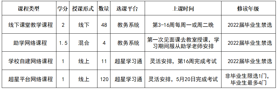 5.特别强调:本学期毕业生不得选修线下课堂教学课程、助学课程及学校自建网课,仅能选修超星平台网课。超星平台网课上课及考试在2022年5月20日前完成。