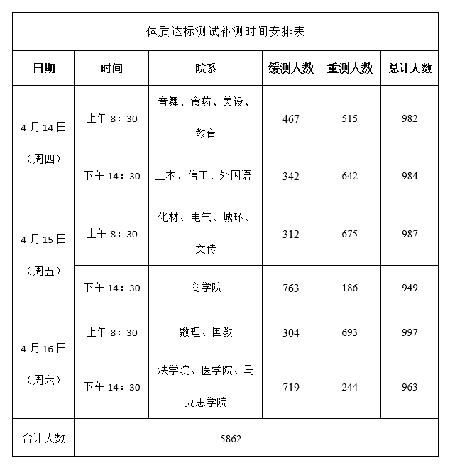 说明:本轮补测合计共5862人,分批在规定时间内依次进行测试。(未参加第一轮测试并且没有登记信息的学生请于补测前到羽飞田径场入口处办公室找郭老师登记信息)。因残疾和先天性心脏病而申请免测的同学请确认免试信息。