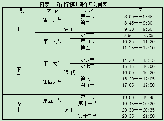 8.上课作息时间如下附表所示,请各单位通知任课教师及学生严格按照该时间表上课。