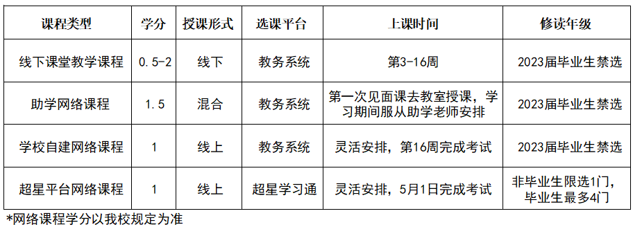 5.特别强调:毕业生不得选修线下课程、助学课程及学校自建网课,仅能选修超星平台网课。超星平台网课上课及考试在2023年5月1日前完成。