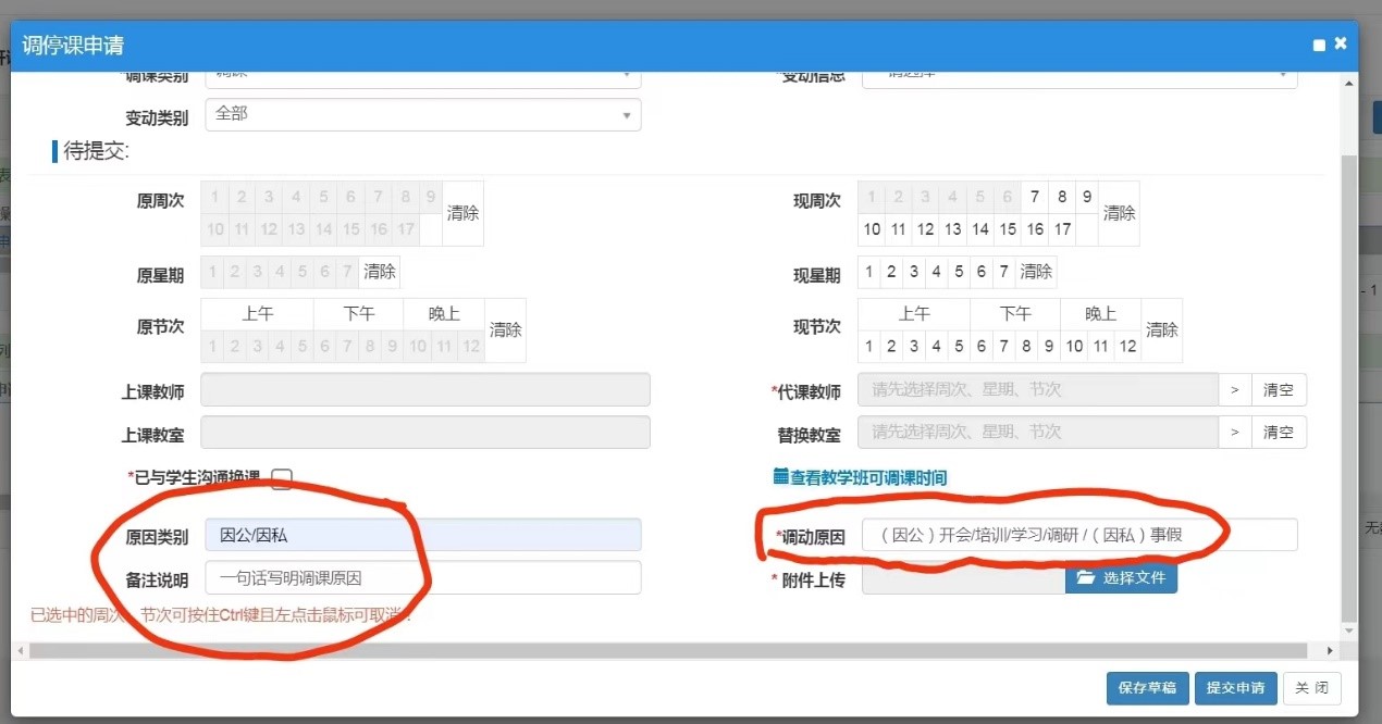 2.调课原因类别栏填写因公或因私,调动原因栏因公填写:开会、培训、学习、调研等;因私填写:事假。调课说明栏应对调课的原因作简要说明。