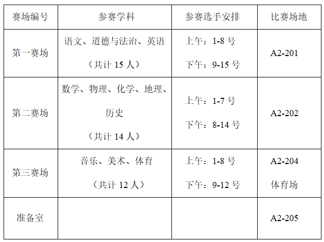 参赛选手须在各场比赛开始前20分钟到达赛场门口等待抽题。各选手比赛开始前15分钟抽取参赛课题(每个学科三个参赛课题的序号按通知文件中课题的先后顺序确定),不按时到场参加抽签的,视为自动弃权。