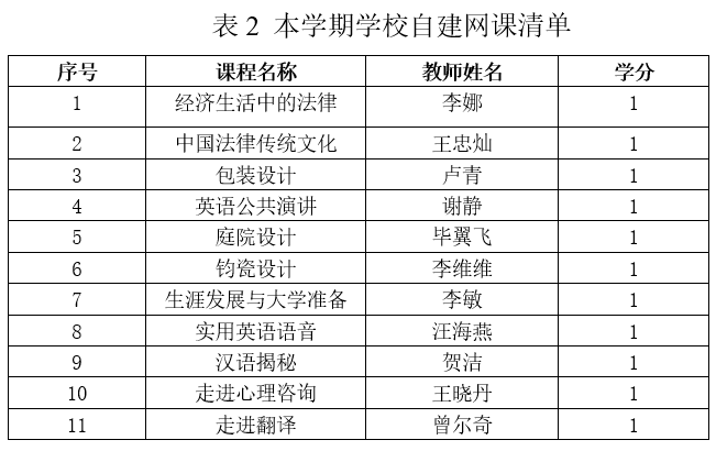 2.我校自建网课课程名单见下表,该类课程通过教务系统选课,上课方式根据任课老师要求通过线上上课。未在教务系统选课、直接在线上平台选课上课,成绩将无法登录,无法获得学分。