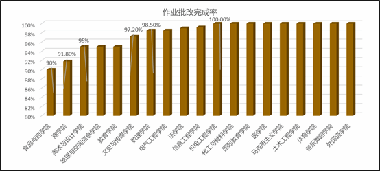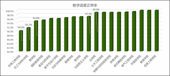 从两幅统计图可以看出,我校19个二级学院中,3个学院教学进度正常,10个学院教学进度低于97%,其中机电工程学院、化工与材料学院教学进度滞后情况比较严重;9个学院作业批改完成率为100%,10个学院存在作业批改率低于99%,其中食品与药学院、商学院作业批改进度有待提高。