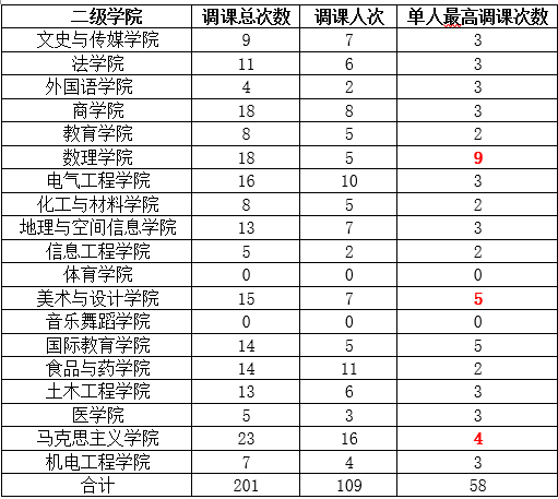 根据《许昌学院教学工作基本规范》(院政教[2018]40号)文件第十章规定:各单位因私调课次数不能超过本院教师人数的25%,每学期每位教师因私调课次数不得超过3次。根据数据统计结果发现,本学期16个学院均能按要求进行调课,但数理学院单人最高调课9次、美术与设计学院单人最高调课5次、马克思主义学院单人最高调课4次。为保证本学期教学正常运行,请各学院加强调课管理,严格执行调课审批制度,严格审批教师调课事宜,对各类会议、出差、进修活动统筹安排,合理配置,严格审查因私调课事由,尽量减少或避免调课,并督促任课教师按时补课,保证日常教学工作规范、有序运行。
